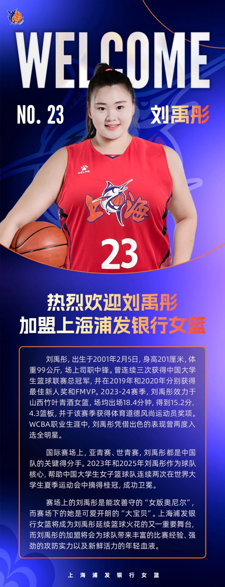 “赛场上的刘禹彤是能攻善守的‘女版奥尼尔’,而赛场下的她是可爱开朗的‘大宝贝’。上海浦发银行女篮将成为刘禹彤延续篮球火花的又一重要舞台,而刘禹彤的加盟将会为球队带来丰富的比赛经验、强劲的攻防实力以及新鲜活力的年轻血液。”上海浦发银行女篮写道。