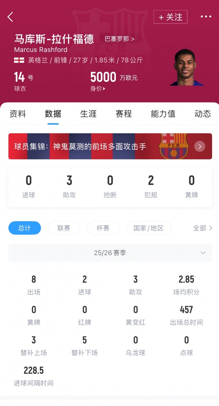 而据此前知名转会记者罗马诺报道,巴萨可在赛季末以3000万欧元买断拉什福德。本赛季拉什福德至今在巴萨出场8次,贡献2球3助。