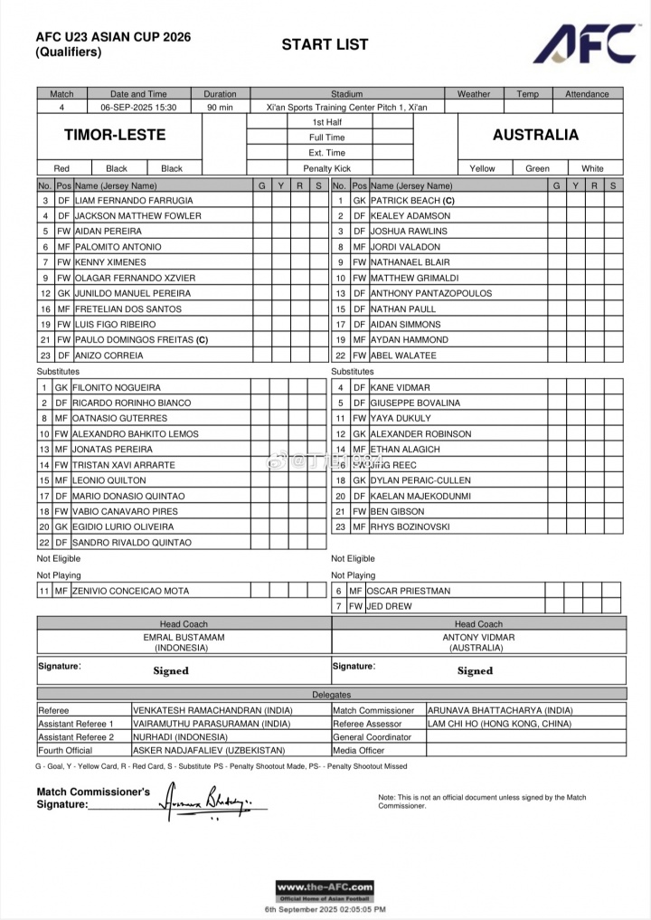09月06日讯 U23亚预赛第2轮,东帝汶vs澳大利亚,双方首发出炉。与第一场14-0大胜北马里亚纳群岛的首发阵容相比,澳大利亚进行了7人大轮换。