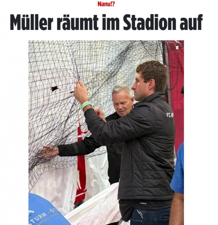 在拜仁5-0大胜汉堡的比赛开赛前,安联球场内突然出现一位与穆勒极为相似的男子。他身穿俱乐部夹克,正在协助清理南看台死忠球迷刚刚用于TIFO表演的红白塑料膜。
